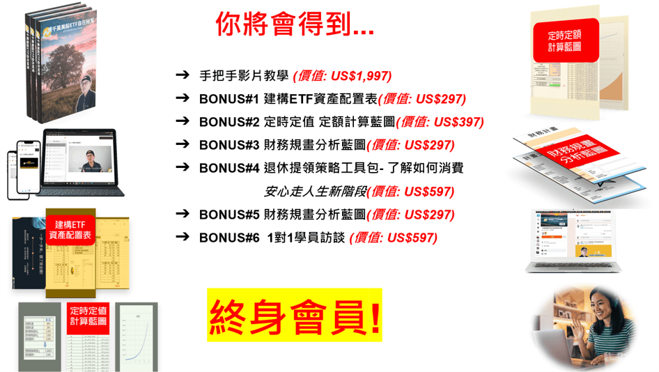 我們不相信快速致富,我們相信提供價值和服務他人,用最少的時間去理財,讓自己去掌握人生主動權,這就是我們的課程初衷。正如法律規定,我們不能也不會提供您任何成果與收益保證。我們不了解您,此外,您的生活結果取決於您,同意嗎?我們盡力提供給您最好的知識與策略幫助您更快地前進。但是,本頁面或我們任何網站、電子郵件、影片中的任何內容均不構成對未來收益的承諾或保證。我們任何網站或電子郵件中引用的任何財務數據僅只是根據過去的結果所做的估算或預測,不應被視為確切的收益數據。所有數字僅為說明用途,如果您有任何疑問,請發送電子郵件至 course@etfgoeasy.com